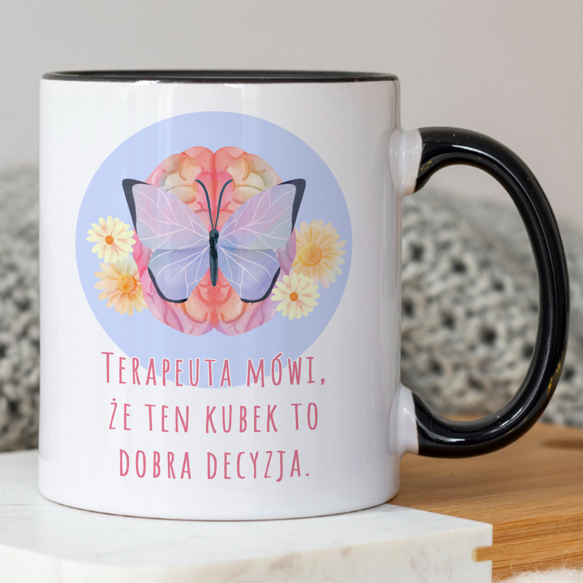 Ten oryginalny kubek z napisem „Terapeuta Mówi, Że Ten Kubek To Dobra Decyzja” to idealny towarzysz porannej kawy dla każdego, kto kocha psychologię, samorozwój i... błyskotliwe cytaty.